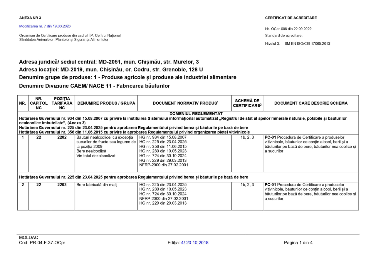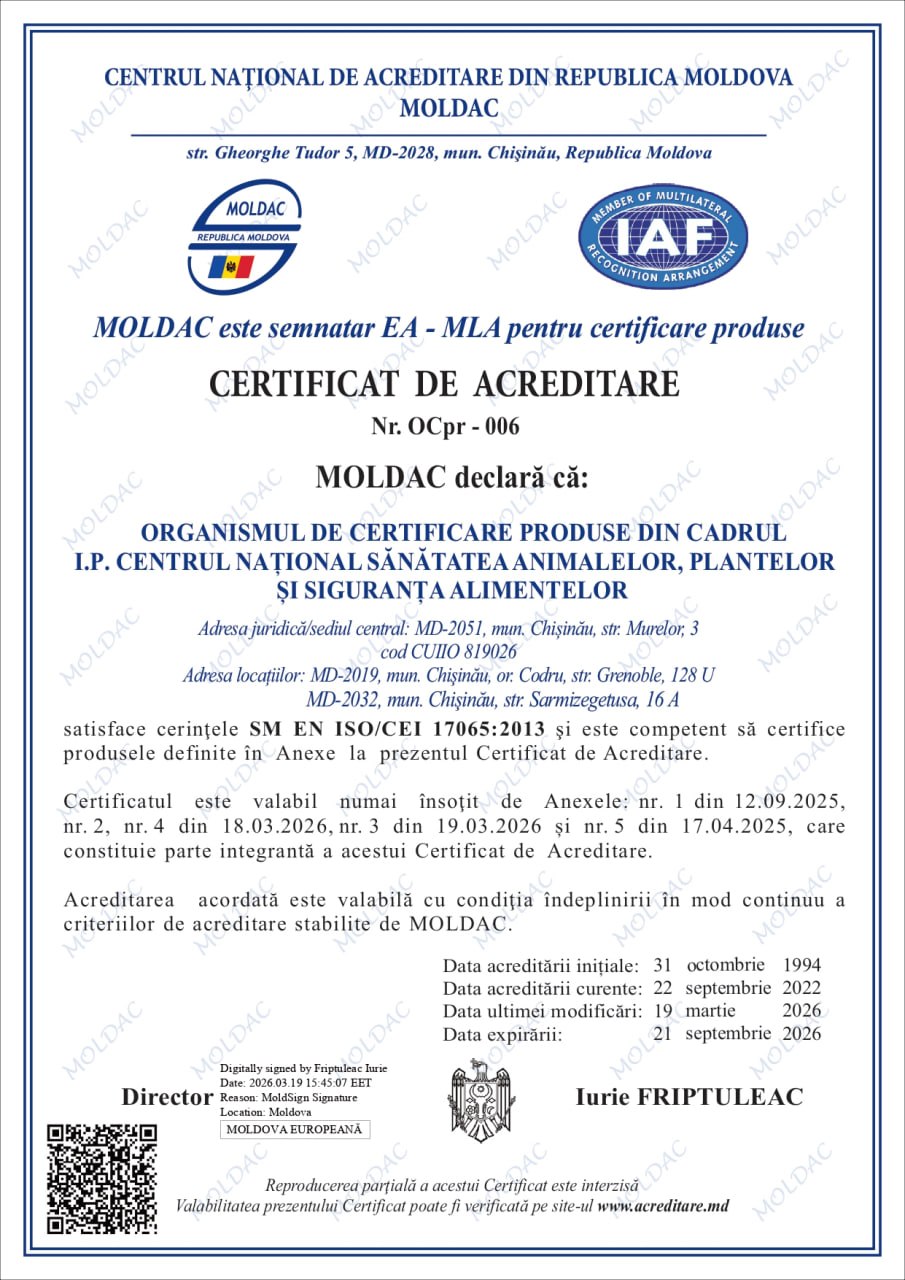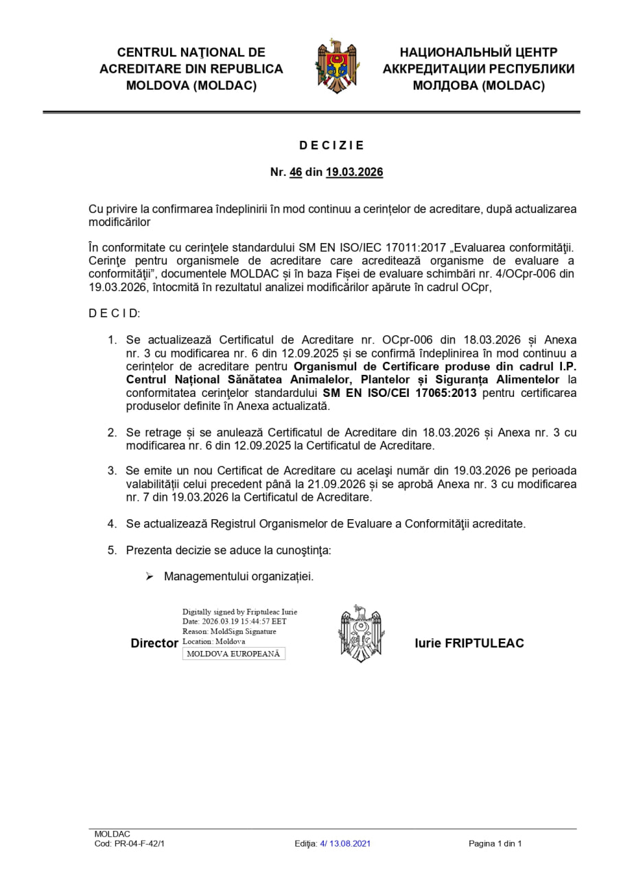 Organismul de certificare din cadrul Instituției Publice „Centrul Național Sănătatea Animalelor, Plantelor și Siguranța Alimentelor” (I.P. „CNSAPSA”) activează în conformitate cu prevederile standardului SM EN ISO/CEI 17065:2013 „Evaluarea Conformității. Cerințe pentru organisme care certifică produse, procese și servicii”.